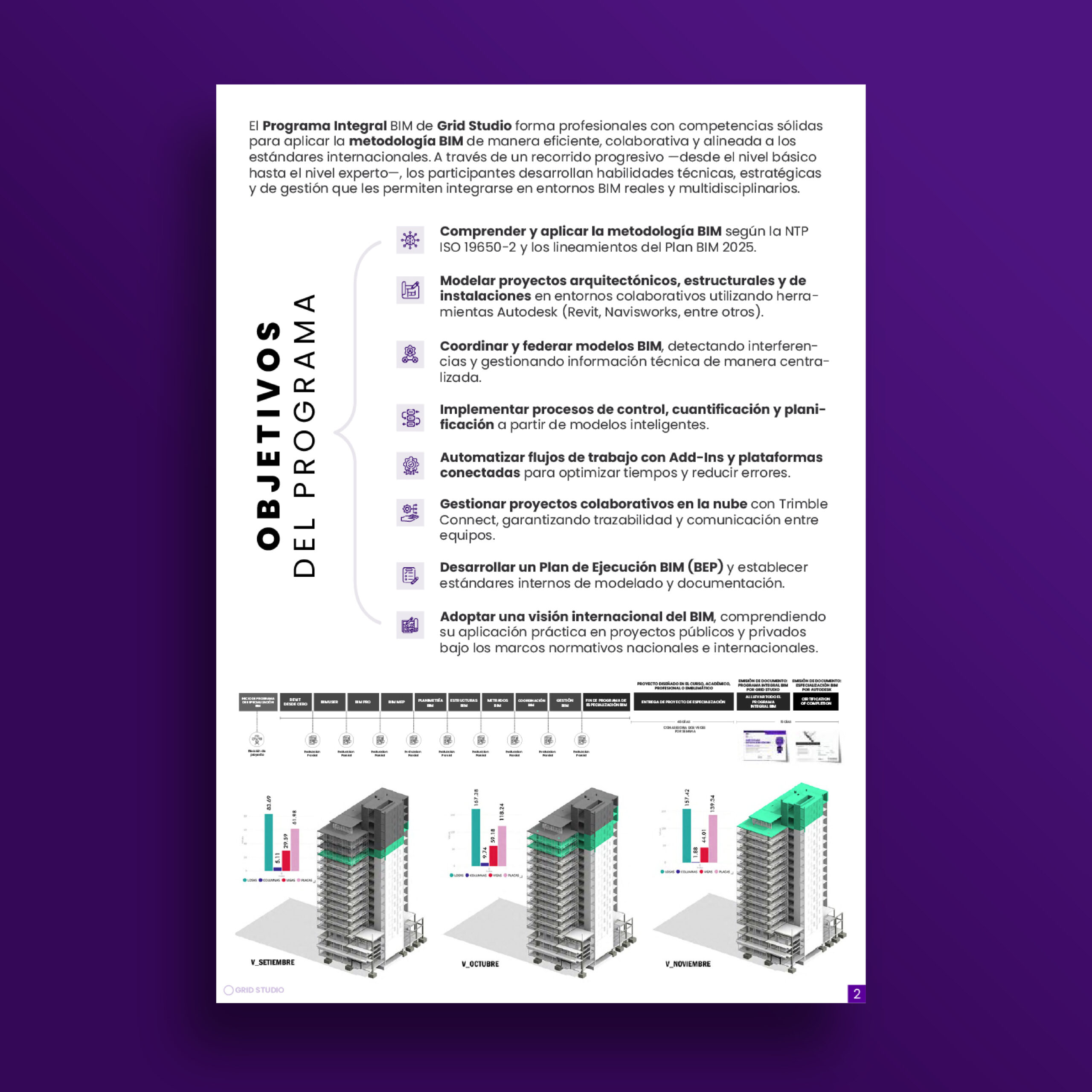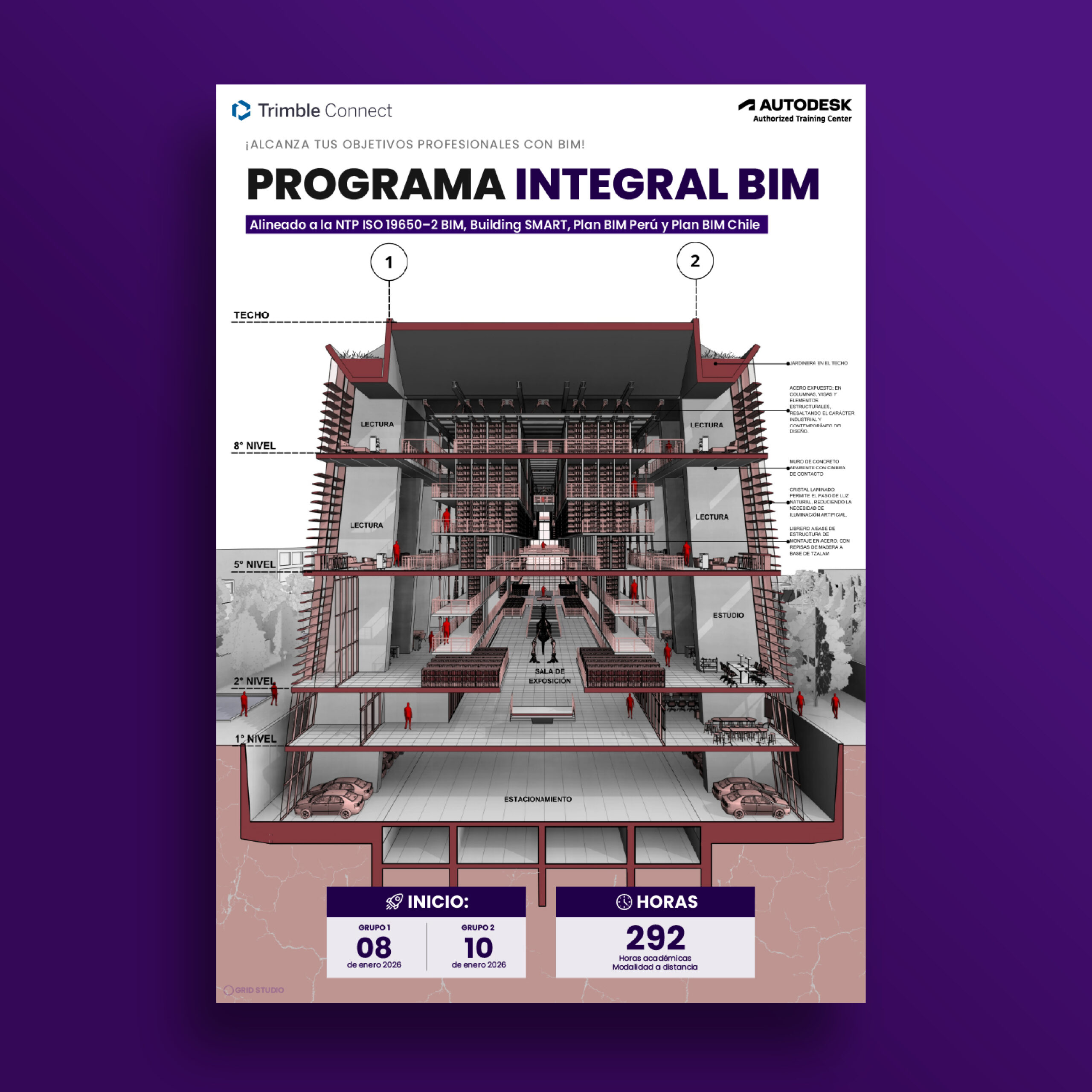 Domina la metodología BIM de cero a experto bajo la norma ISO 19650-2 y los estándares Plan BIM Perú/Chile. Aprende con proyectos reales usando Revit y Navisworks, y obtén tu doble certificación internacional (Autodesk + Grid Studio).